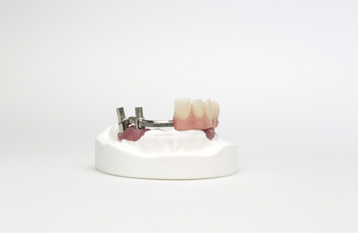 Titanium bridge structures in various designs for the veneering of acrylic teeth.